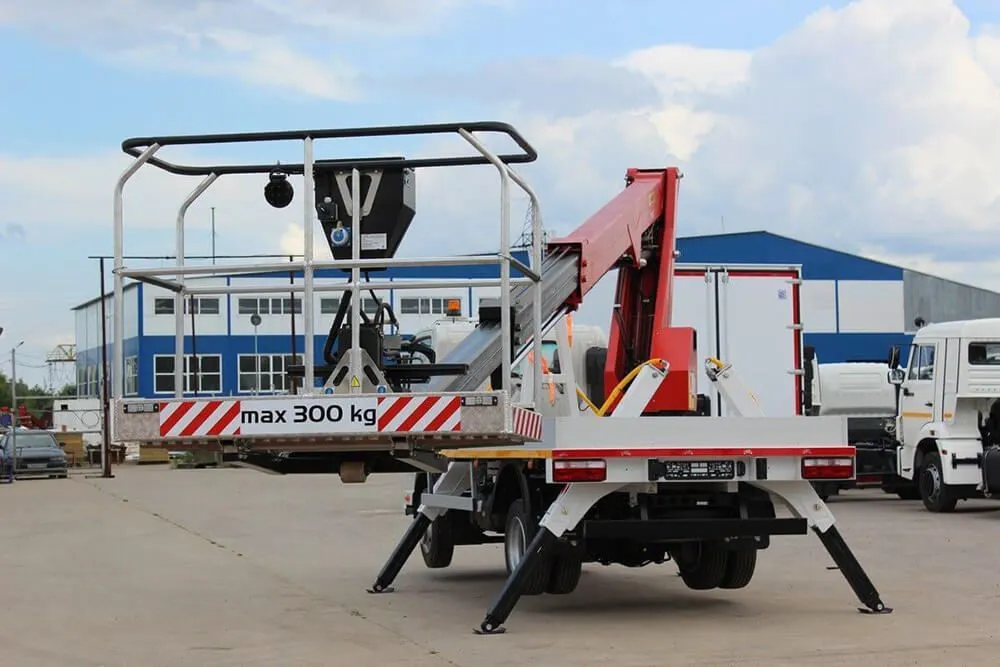 - Безопасность. В составе автовышки предусмотрен насос аварийного типа, который станет незаменимым помощником во время непредвиденных ситуаций. Стабилизация опор при выполнении работ осуществляется с помощью специальной системы безопасности. В комплектацию подъёмника также входит стабилизатор устойчивости, рулевая колонка и прочие компоненты. Предусмотрен ящик для инструментов. Конструкция автовышки исключает появление коррозии и повреждений механического характера.