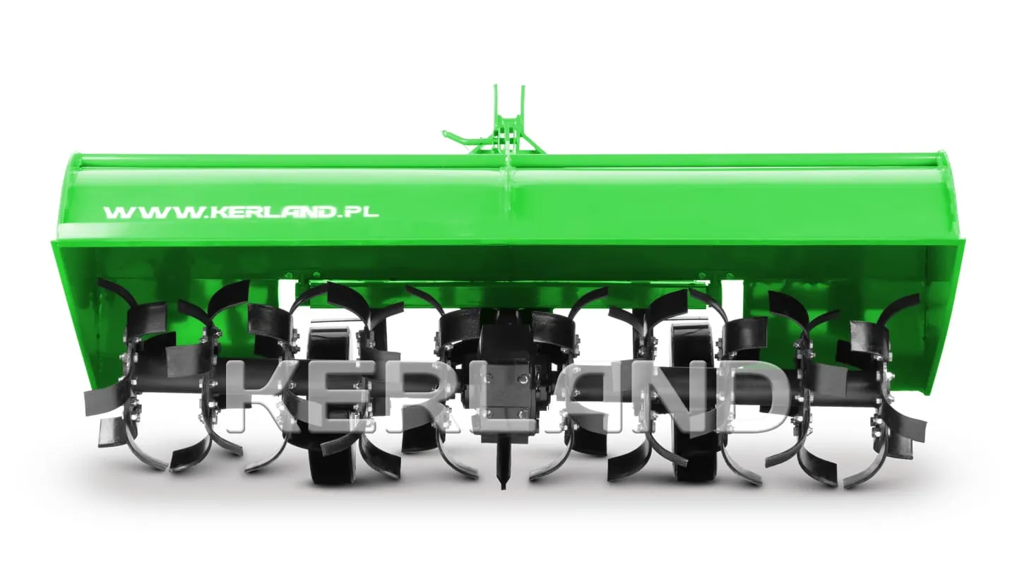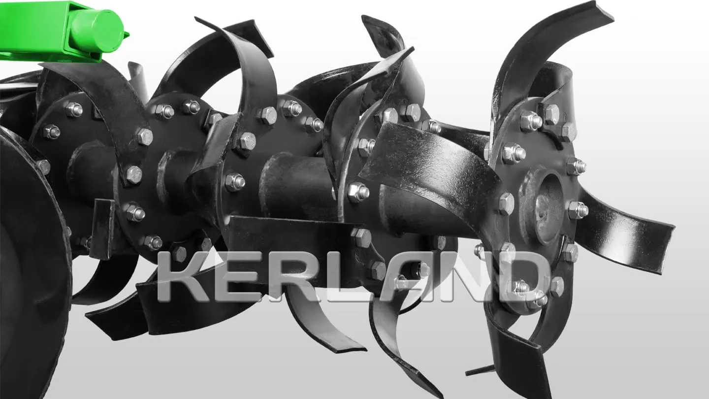 Основным функциональным элементом активной почвофрезы Kerland W 1600 является рабочий вал с 48 ножами ТМ WIRAX, изготовленными из особо прочной легированной стали. Привод механизма осуществляется от стандартного ВОМ мини-трактора со скоростью вращения 540 оборотов в минуту. В состав конструкции почвофрезы Керланд W1600, кроме вала с «фирменными» ножами, входят следующие узлы и комплектующие: